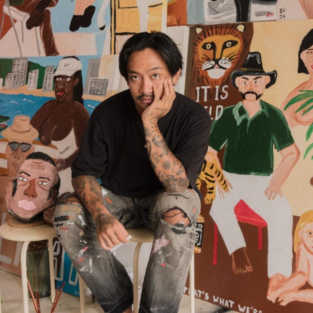 Rai Julian, a Canggu-based artist whose path has crossed various disciplines, brings a poetic approach to his art. With roots in Bandung and experiences that span culinary arts to underground music, Julian’s art is a reflection of the diversity around him. His work is a visual ode to his community, celebrating the beauty of everyday stories through intricate layers of color and texture. Julian’s paintings resonate with a joyful yet introspective energy, bridging the tangible and the intangible in a narrative of shared humanity.